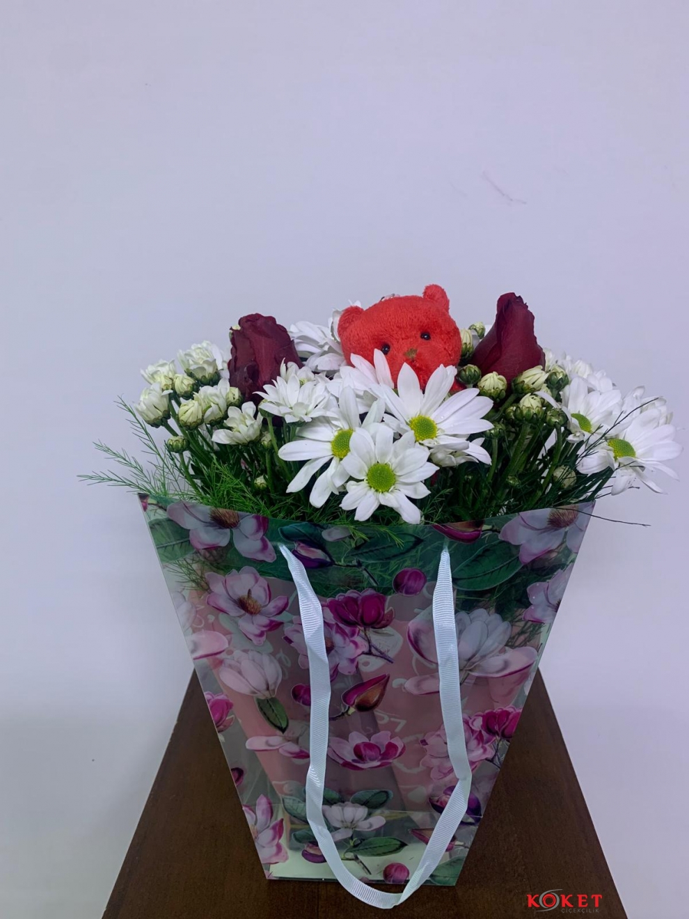 Çantada Ayıcıklı Güllü Papatya Arajmanı Tasarım 'da kullanılan çiçek ve aksesuarlar stok durumuna göre farklılık gösterilebilir.