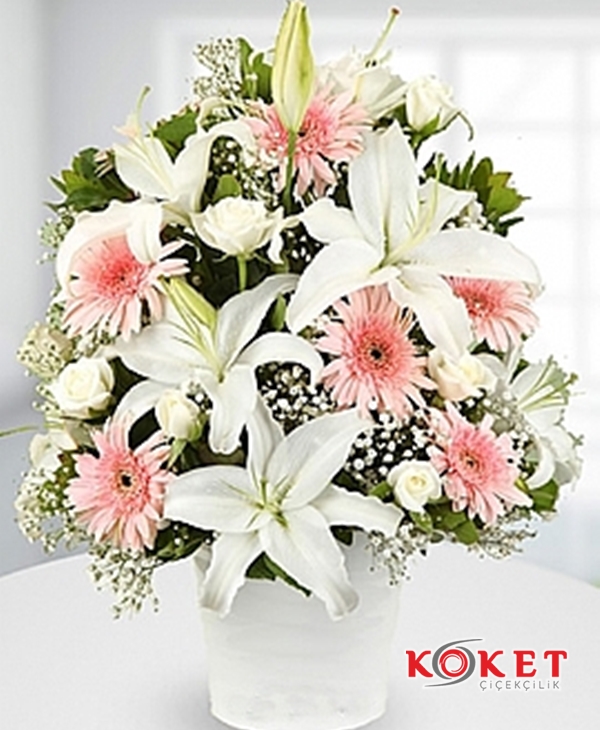 Pembe Beyaz Aranjman Tasarım 'da kullanılan çiçek ve aksesuarlar stok durumuna göre farklılık gösterilebilir.